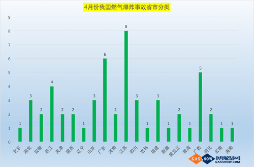 2017年4月發(fā)生燃?xì)獗ㄊ鹿是?位省份依次為江蘇省(8起)、廣東省(6起)、廣西?。?起)、浙江?。?起)、湖北?。?起)、山東?。?起)、四川?。?起)、福建省(3起)。